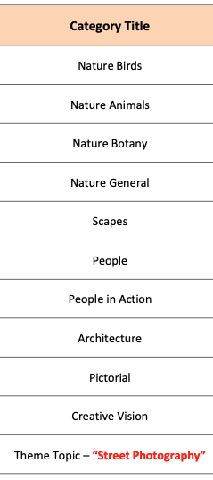 | Contest 1-3: Enter 2 photos, one in the category shown, one in Open (your choice) | |||